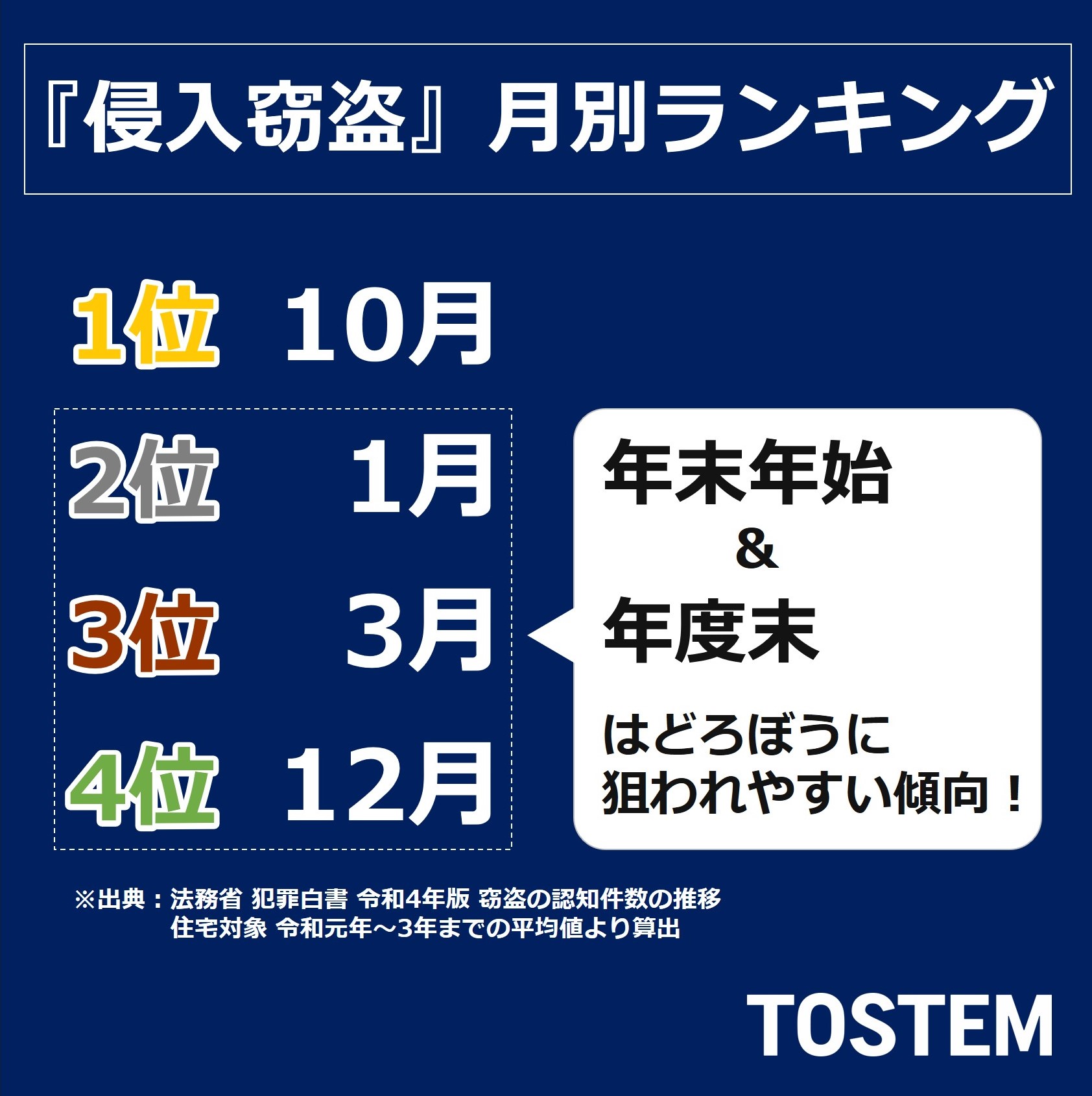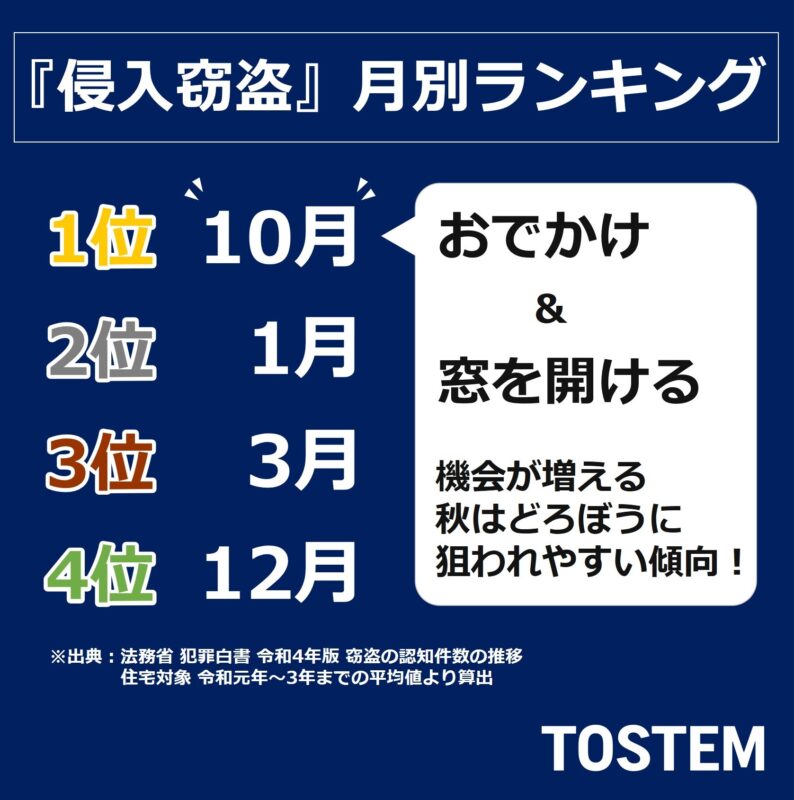 こちらの「侵入窃盗ランキング」によると10月以降が狙われる傾向が高い様です・・・。