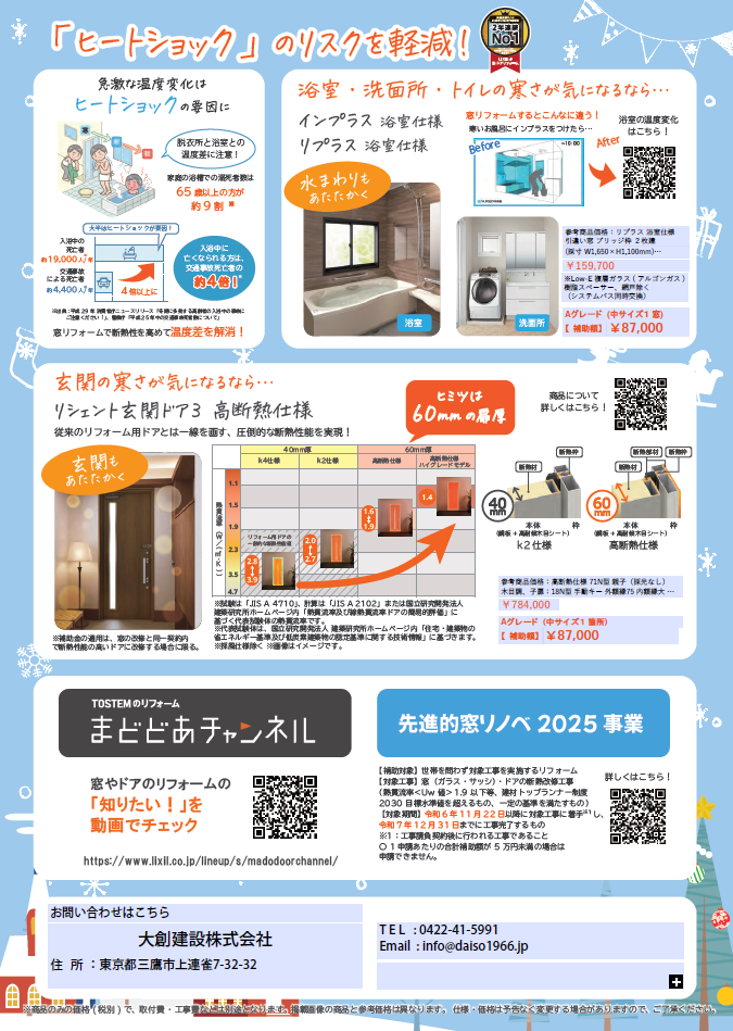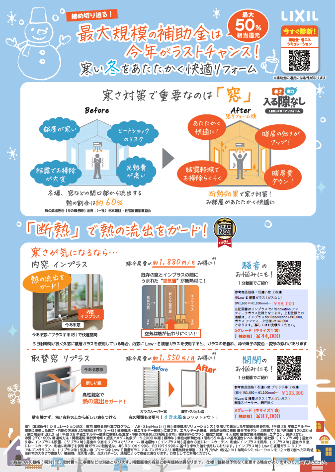 窓のリフォームをすると断熱効果でお部屋が暖かく快適に。ヒートショック対策にも有効です。
