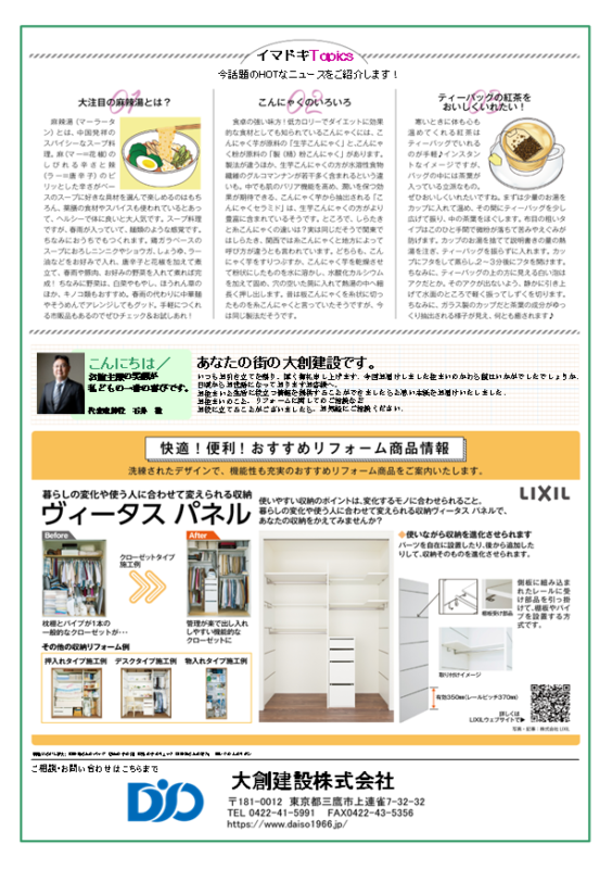 大創建設<住まいのかわら版>2026.1月号 今月の【住まいのかわら版】です! テーマは「足腰を鍛えて毎日を健やかに楽しみましょう!」です。 いつまでも元気でいるには、しっかり歩けること。 そのためには、足腰を鍛えて、筋肉量を増やすことが大切です。