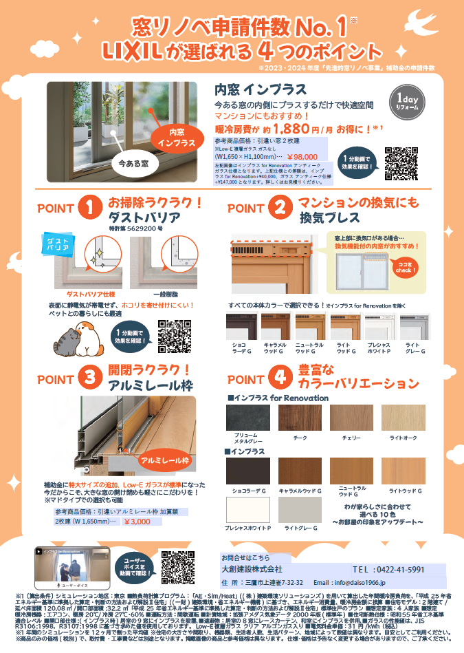 今年も内窓施工で最大100万円の補助金が出ますので、お得にリフォームが可能です。