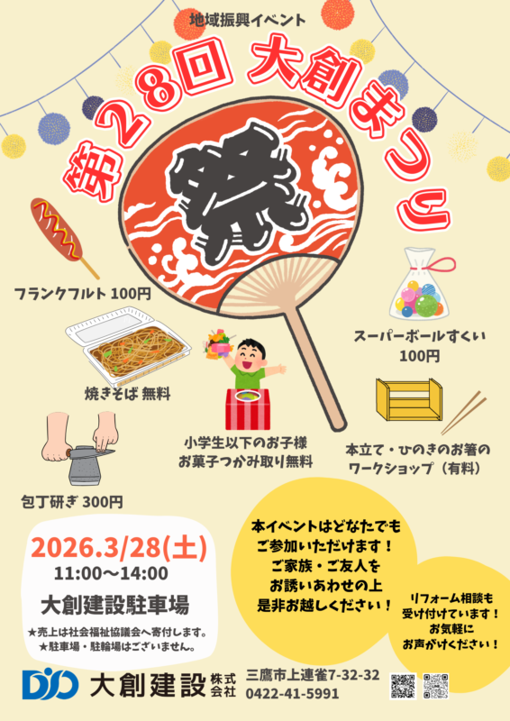 第28回大創まつりのお知らせです!! 日時:2026年3月28日(土)11時~14時 場所:三鷹市上連雀7-32-32 大創建設駐車場 ●焼きそば 無料! ●フランクフルト 100円!※LINEおともだちの方は「フランクフルトプレゼントチケット」を配布いたします ●スーパーボールすくい 100円! ●小学生以下のお客様!お菓子つかみ取り無料! ●桧のお箸と本立てを作ることができるワークショップもあります!(有料) ●包丁研ぎ1本300円!(1人3本まで) ●端材販売1個100円! 建物に関するご相談も随時受け付けております。 是非皆様、ご家族ご友人をお誘いの上お越しください! 社員一同お待ちしております! ※駐車場・駐輪場はございません。