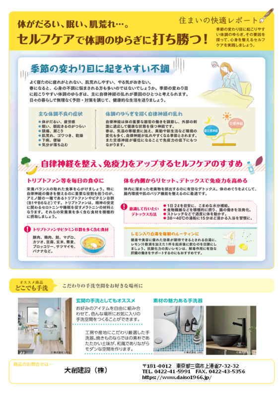 【住まいの快適レポート2026.3】セルフケアで体調のゆらぎに打ち勝つ! こんにちは! 今回は、「セルフケアで体調のゆらぎに打ち勝つ!」をご紹介します。 季節の変わり目に起こりやすい体調のゆらぎ、その要因を探って、心身を整えるセルフケアを実践しましょう。 大創建設
