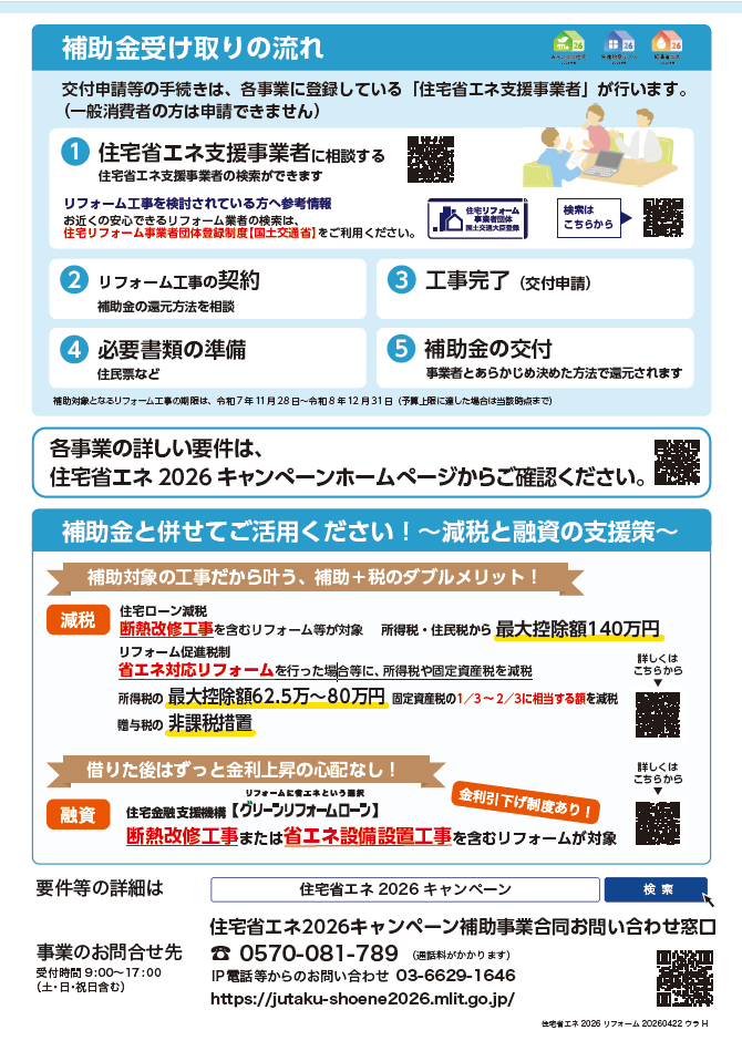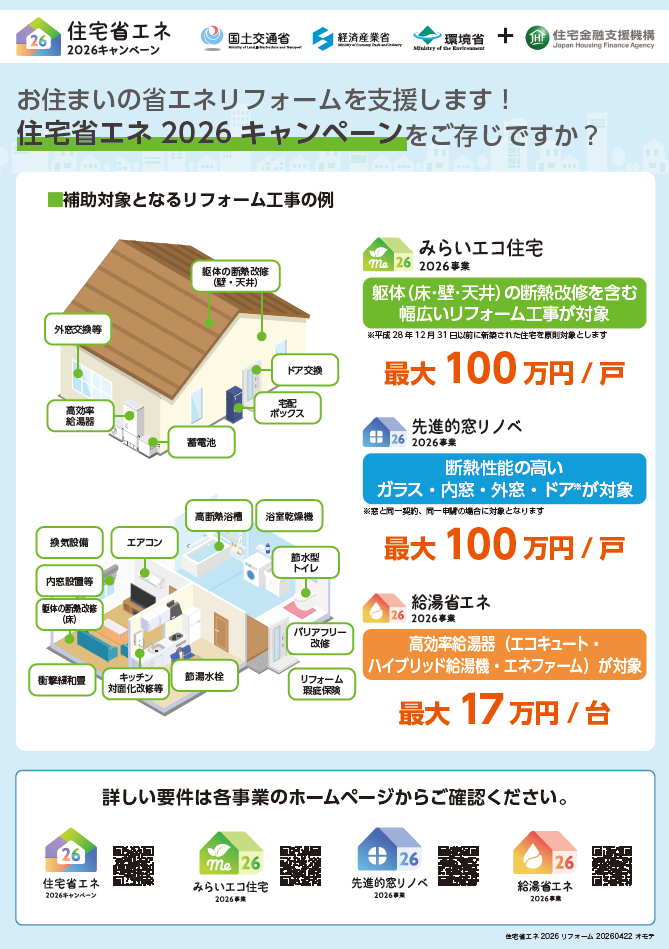 「住宅省エネ2026キャンペーン」ご存知ですか? 昨年は、断熱性の高い内窓はもちろん節水水栓や高断熱浴槽など、様々なリフォームにこの助成金を活用いたしました! 是非今年こそはとリフォームをご検討中のお客様!是非お問い合わせお待ちしております! 大創建設
