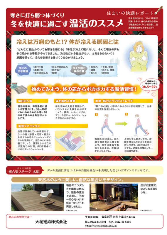 こんにちは! 寒い日が続いておりますが体調にお変わりはないでしょうか。 今回は、「寒さに打ち勝つ体づくり!冬を快適に過ごす温活のススメ」をご紹介します。 毎日の入浴や、軽いストレッチ等で改善されます! 是非、簡単なものか […]