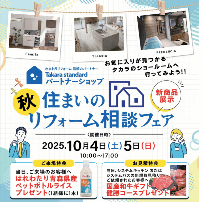 【Takara standard】住まいのリフォーム相談フェア 10/4(土)、10/5(日) 10:00~17:00 タカラスタンダード三鷹ショールームにて開催されます。 リフォームをご検討中のお客様、是非この機会に大 […]