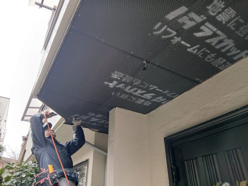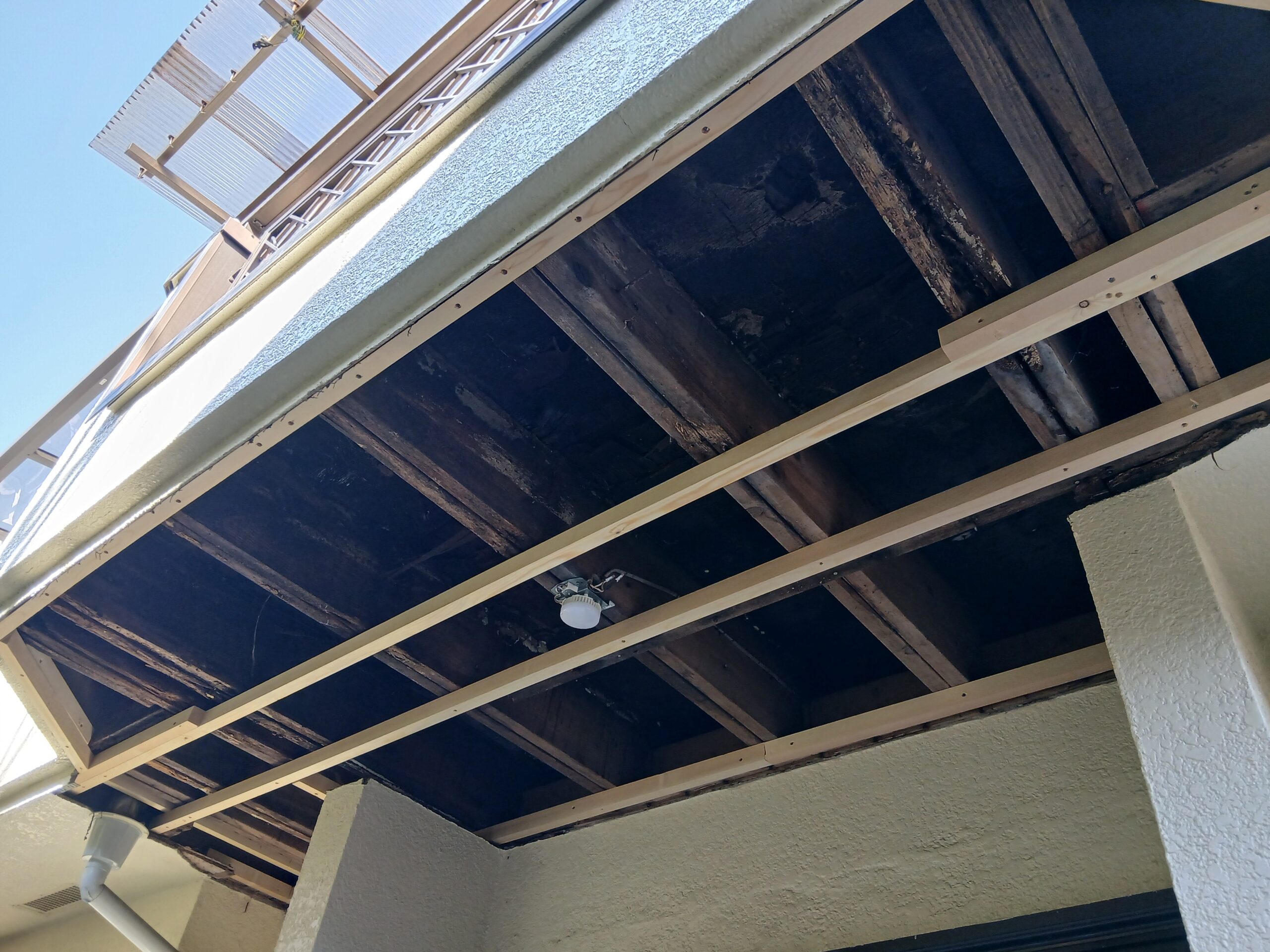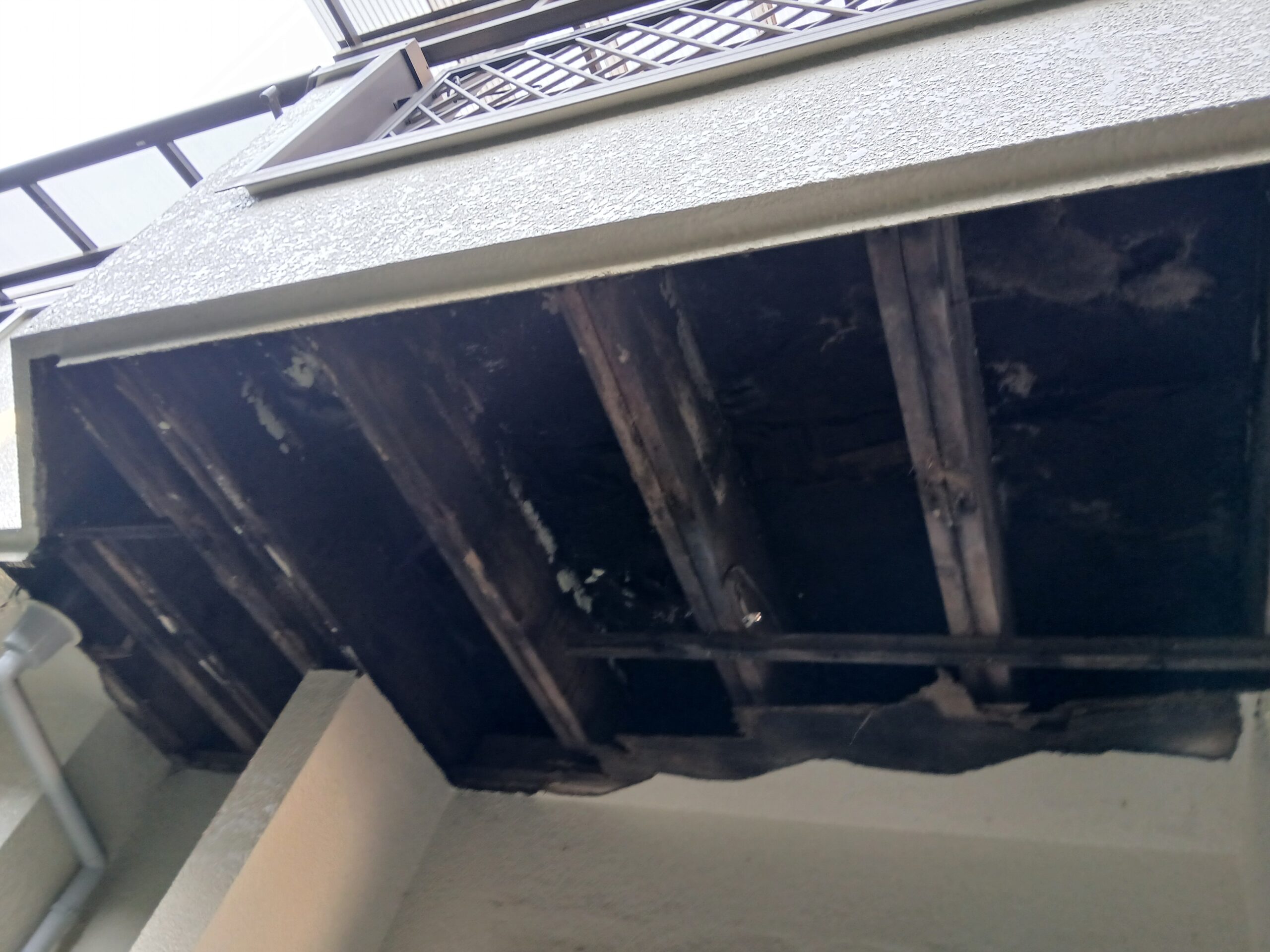玄関屋根改修工事 武蔵野市K様 [ 武蔵野市 K様 ] 施工箇所:玄関屋根 出費:26万円 お客様のご要望・お悩み バルコニーに亀裂が入った為先に防水工事をされたK様。その後下の天井に取り掛かりました。中の木材が腐ってしまっていました。 施工前 施工後